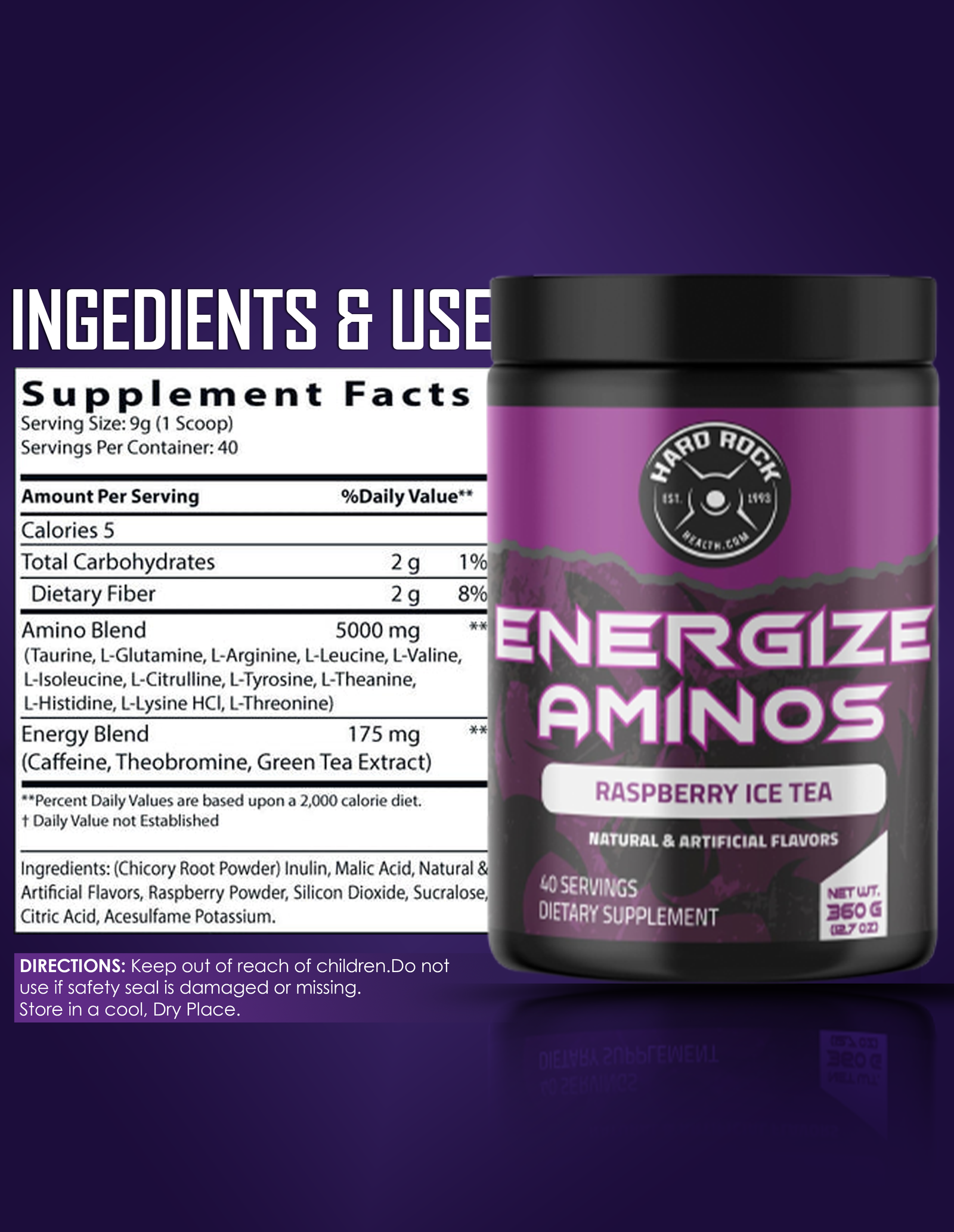 ard Rock Health Energized Aminos elevate the amino energizer category to new heights. Our Energized Aminos uses groundbreaking Leucine enhanced Amino9TM, a clinically validated blend of the nine necessary amino acids, rather than putting together random amino acid proprietary blends like other competitors. The Raspberry iced tea provides long-lasting energy. Highlights of Energized Aminos: